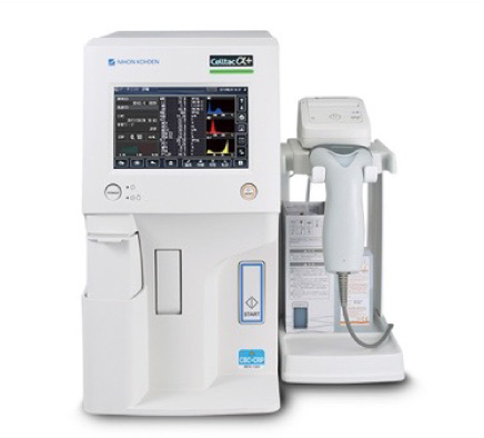 日本光電社製のMEK-1303 セルタックα+を導入しています。白血球3分類を含む20項目とCRP(C反応性蛋白)を同時に測定できる装置です。少量の採血で炎症の有無、HbA1c、白血球や赤血球数などを測定できます。