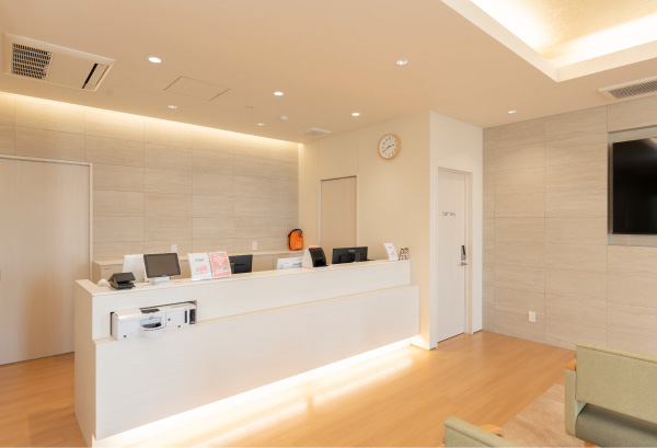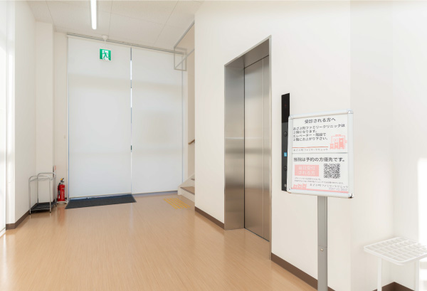 エレベーターまたは階段で2階クリニックまで上がっていただけ ます。エレベーターはベビーカーや普通サイズの車いすもご利用いただけます。また、2階トイレは乳児のオムツ替え・車イスにも対応しています。