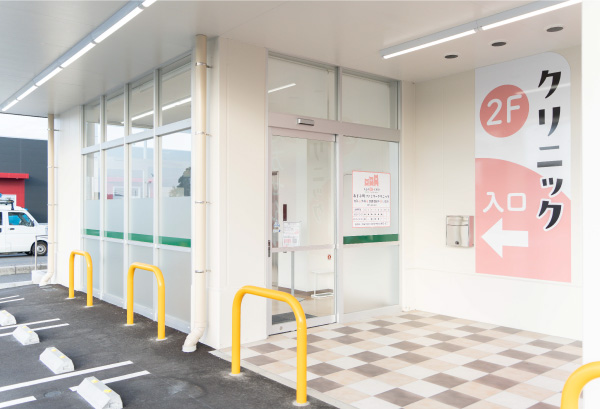 クリニックはドラッグストアの2階です。 調剤薬局も併設されています。広々とした駐車場ですので、車の運転が苦手な方にも安心してご利用いただけます。